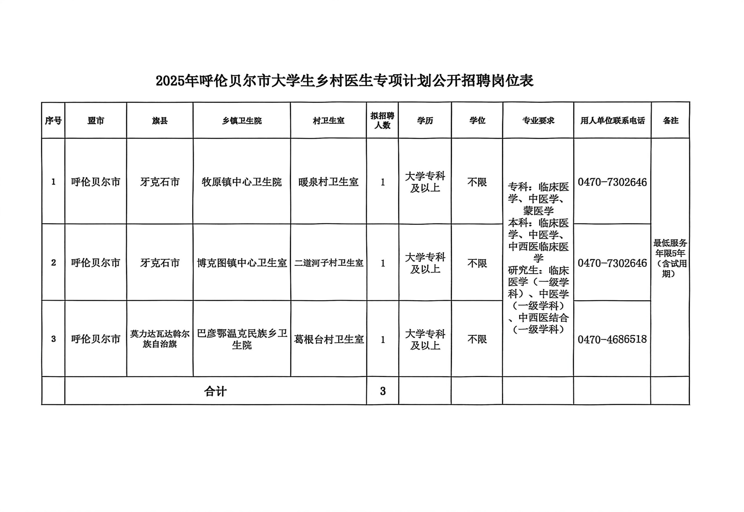 牙克石市牧原镇中心卫生院暖泉村卫生室招聘1人,牙克石市博克图镇中心卫生室二道河子村卫生室招聘1人,莫力达瓦达斡尔族自治旗巴彦鄂温克民族乡卫生院葛根台村卫生室招聘1人。岗位需求详见《2025年呼伦贝尔市大学生乡村医生专项计划岗位需求表》。