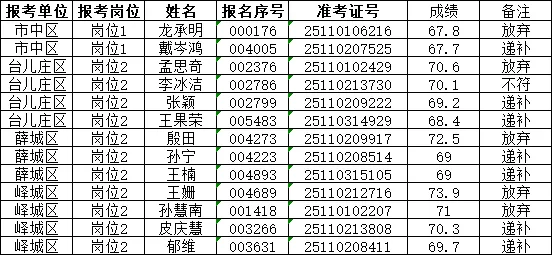 按照《2025年枣庄市工会社会工作者公开招聘公告》规定,资格审查不通过的,取消其面试资格。因放弃或取消资格造成的岗位空缺,从报考该岗位且达到笔试合格分数线的应聘人员中,按笔试成绩从高分到低分依次递补。最后一名笔试成绩并列的,同时确定为面试人选。现将递补人员名单予以公布如下: