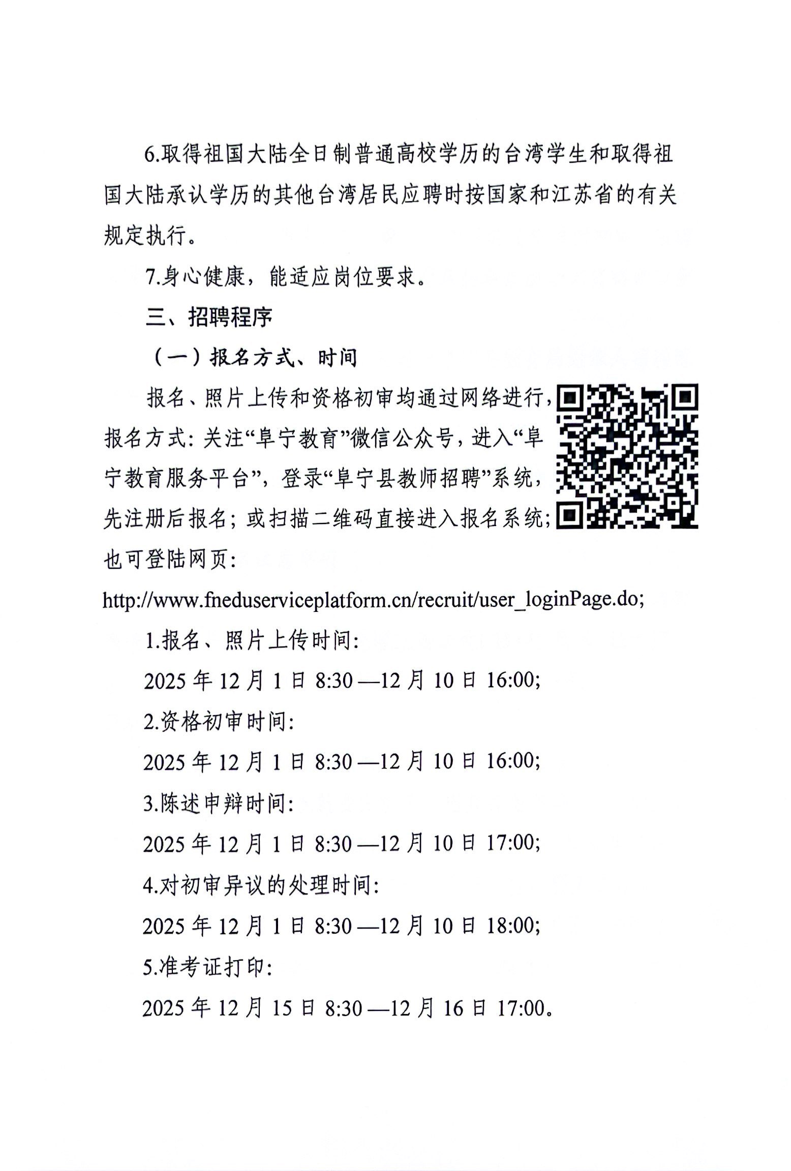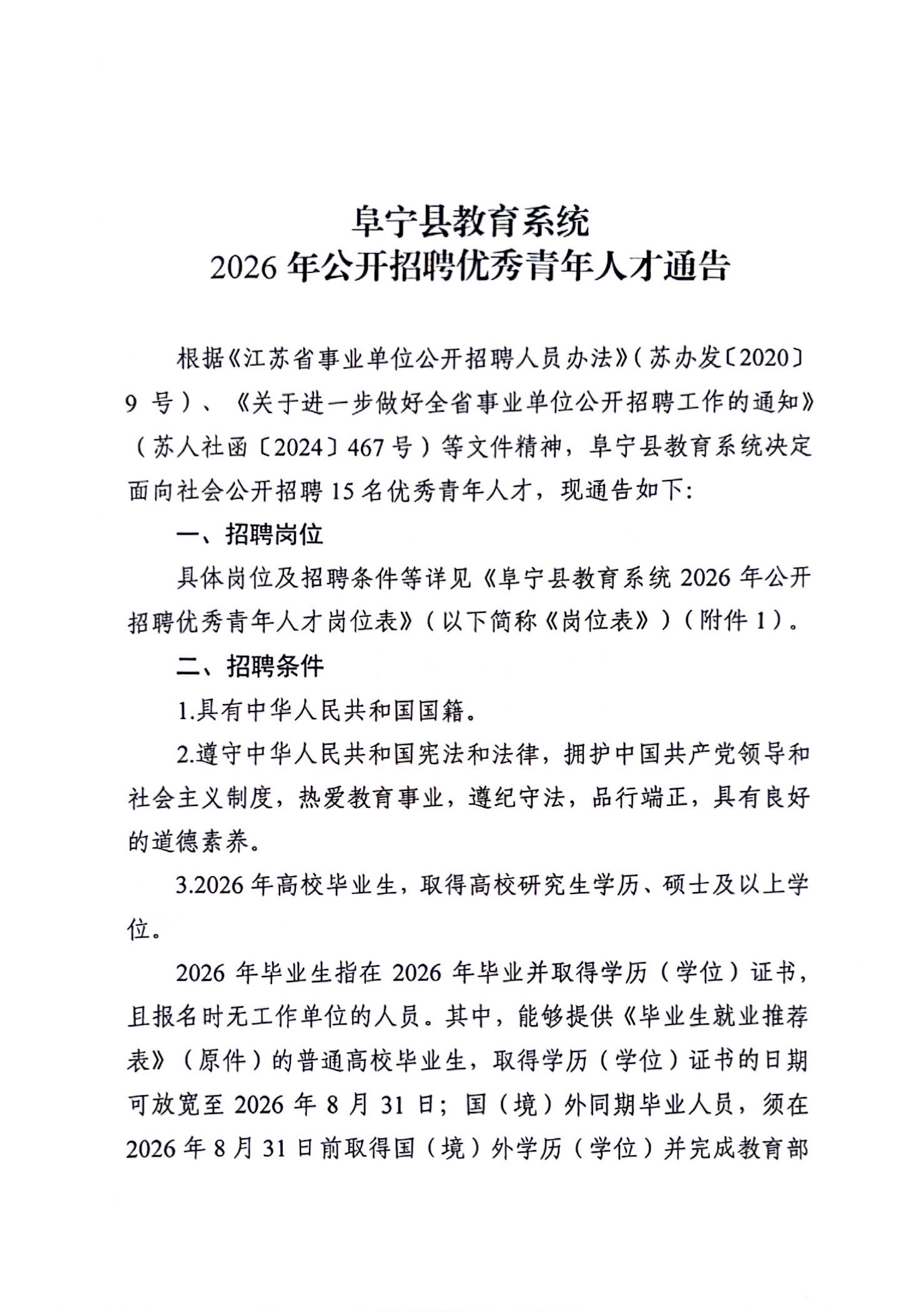 阜宁县教育系统2026年公开招聘优秀青年人才通告 小助手 • 2025 年 11 月 28 日 下午8:25 • 全国, 招考公告, 教师, 江苏, 盐城, 阜宁 • 阅读 3 很抱歉,您提供的文本中不包含具体的招聘职位、职位描述、报名时间等有效信息,仅包含无法访问的图片链接和一段免责声明。因此,我无法基于此内容为您生成符合要求的摘要。请您提供包含具体招聘信息的文本内容。 本网站所转载内容的源网站以及涉及的相关单位及个人信息的真实性、准确性和合法性均由发布网站所有者负责,本网站对此不承担任何保证责任,如有侵权的行为,请及时与客服联系,我们将立即删除并配合妥善处理。 赞 (0) 小助手 0 0 生成海报 花都区炭步镇人民政府公开招聘专职消防员公告 上一篇 2025 年 11 月 28 日 下午8:25 江门市某机关单位招聘启事 下一篇 2025 年 11 月 28 日 下午8:26 相关推荐 [昆山] [教师] 昆山高新区南星渎小学公开招聘派遣制社会化用工(帮厨)简章 2025 年 10 月 30 日 [浦江] [医疗] 浦江县2025年县属医疗卫生单位赴浙江中医药大学等医学院校招聘优秀卫生专业技术人员公告 2025 年 2 月 27 日 [山东] [国企] 2025年“才聚齐鲁成就未来”山东能源集团营销贸易有限公司所属企业社会招聘简章 2025 年 5 月 31 日 [松江] [事业单位] 上海对外经贸大学金融管理学院教学秘书招聘启事 2025 年 7 月 23 日 [牡丹] [教师] 菏泽学院2025年公开招聘高层次人才简章(第六批) 2025 年 11 月 30 日 [临沂] [教师] 2025年临沂市普通中小学公开引进师范类高校优秀毕业生公告 2025 年 2 月 21 日 [麻栗坡] [医疗] 麻栗坡县杨万乡卫生院关于公开招聘编外人员的公告 2025 年 3 月 24 日 [霞山] [事业单位] 2025年湛江经济技术开发区应急管理局公开招聘专职安全员公告 2025 年 3 月 19 日 [南山] [教师] 深圳市南山区海月花园幼儿园招聘公告 2025 年 7 月 8 日 [雨城] [教师] 雅安市雨城区人力资源和社会保障局关于2025年考核招聘四川省公费师范毕业生的公告 2025 年 5 月 21 日 发表回复 您的邮箱地址不会被公开。 必填项已用 * 标注*昵称: *邮箱: 网址: 记住昵称、邮箱和网址,下次评论免输入 提交