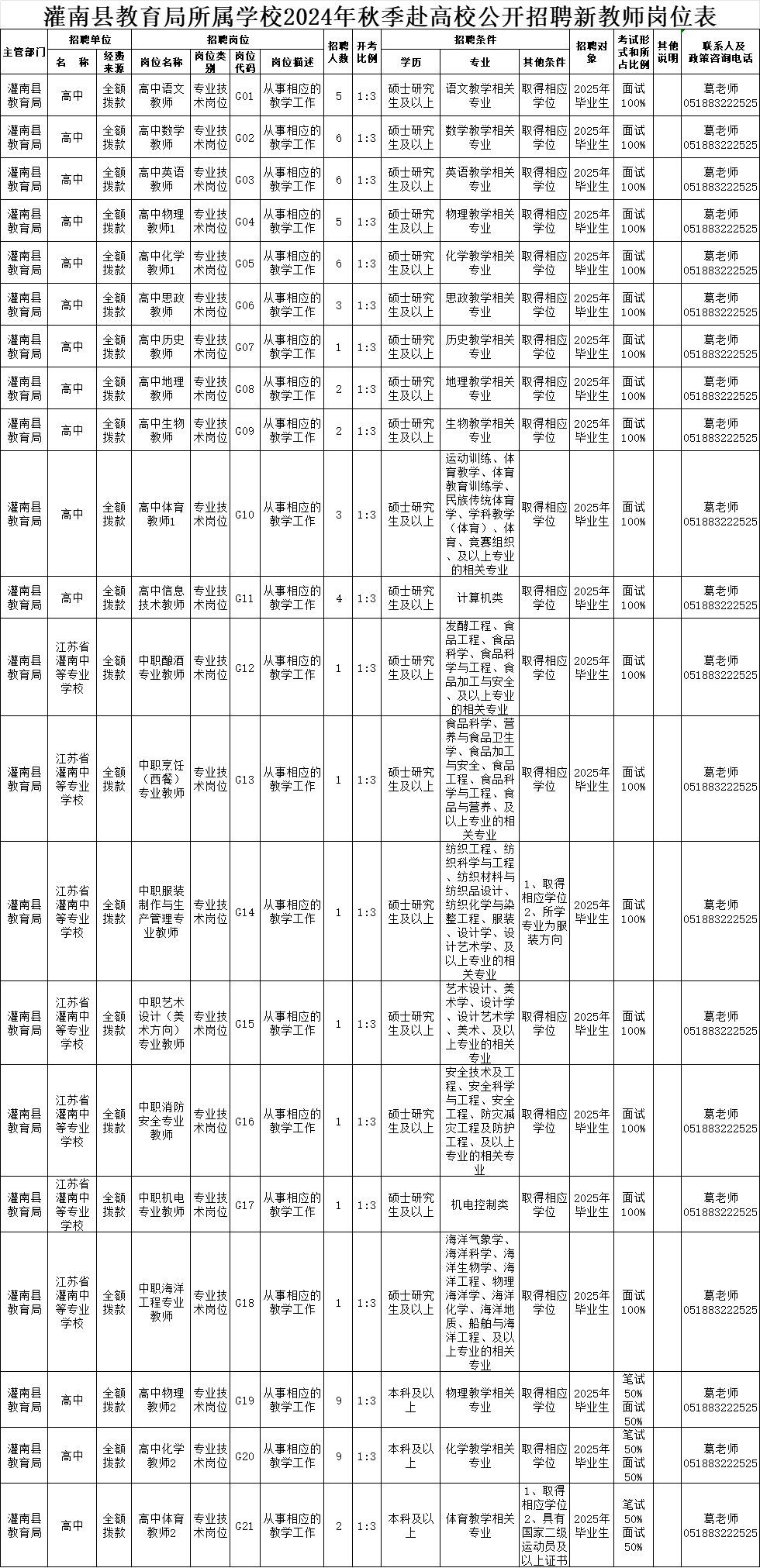 具体岗位及各岗位招聘条件等详见《灌南县教育局所属学校2024年秋季赴高校公开招聘新教师岗位表》(