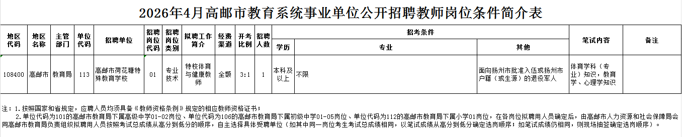 近日,高邮市发布《2026年4月高邮市教育系统事业单位公开招聘教师公告》,高邮市荷花塘特殊教育学校体育与健康教师岗位定向招聘扬州市批准入伍或扬州市户籍(或生源)的退役军人。