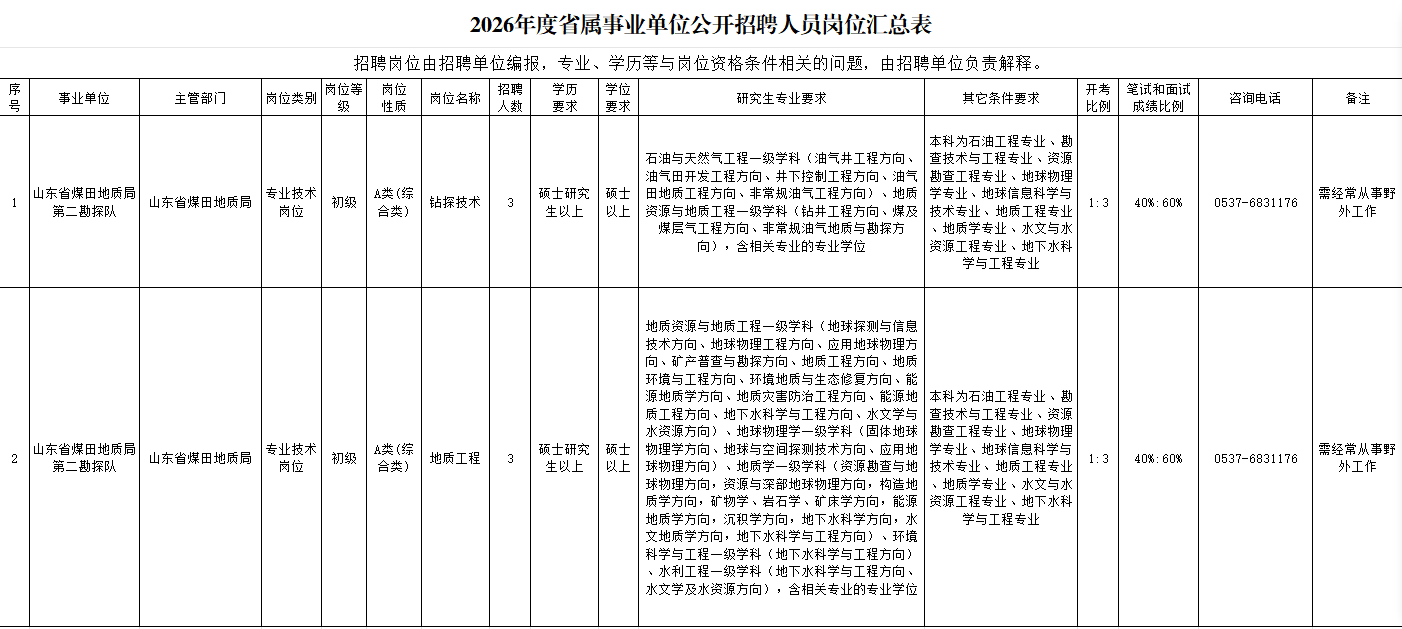 根据山东省事业单位公开招聘有关规定,结合工作需要,我队拟面向社会公开招聘工作人员6名。具体岗位及条件详见《山东省煤田地质局第二勘探队公开招聘工作人员岗位汇总表》。